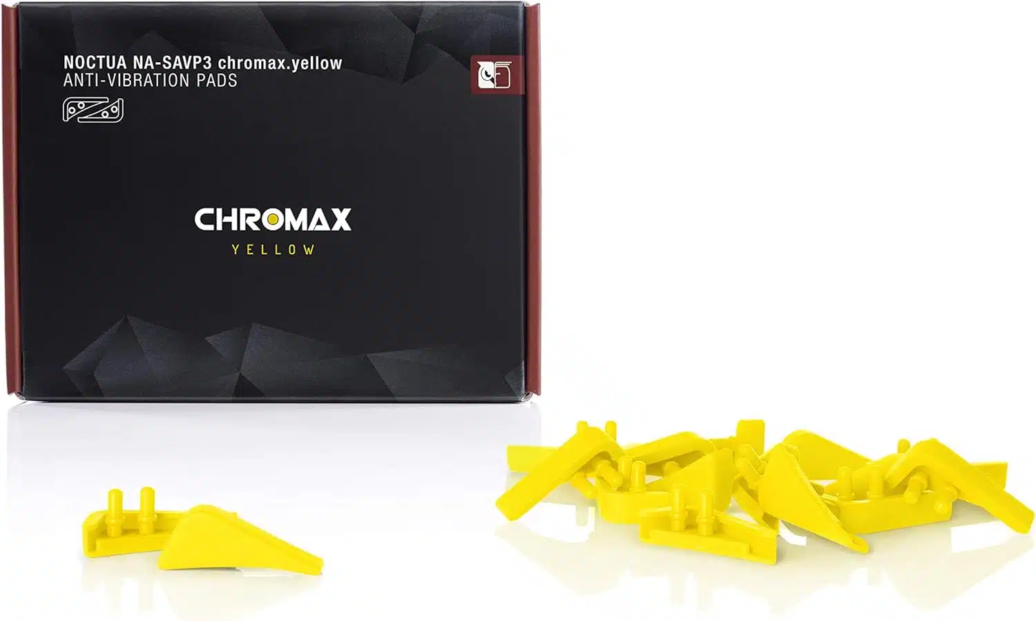 The NA-SAVP3 chromax.yellow is a fan accessory set consisting of 16 black NA-AVP3 anti-vibration pads for up to 2 compatible round 140mm fans such as the NF-A15 (see compatibility info). Made from extra-soft silicone, the NA-AVP3 pads minimise the transmission of minute vibrations while maintaining full compatibility with standard fan screws and most other mounting systems. At the same time, the chromax.yellow edition is ideal for adding yellow accents to Noctua’s NH-D15 chromax.black or chromax line fans in order to colour-coordinate them with individual build themes.