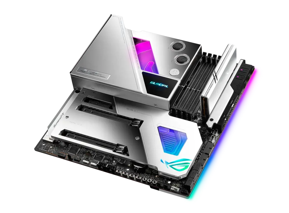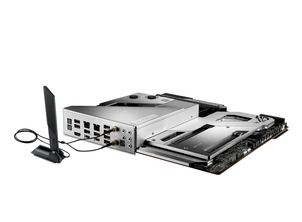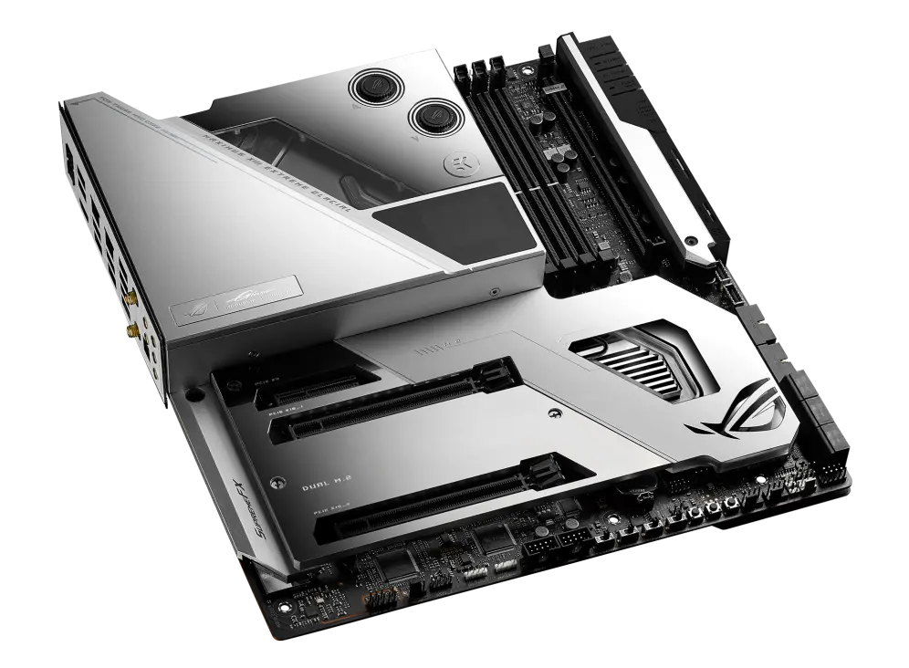 - Optimized Thermal Design: Integrated EK Ultrablock that cools VRM, CPU and PCH; high-conductivity thermal pads, five M.2 heatsinks with embedded backplates and ROG Water-Cooling Zone